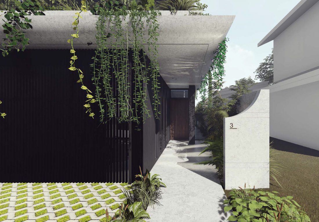 Contemporary off-form concrete multi-level home situated on the river at Brunswick Heads, NSW. Expansive roof garden surrounds the upper-level section of the residence. Architect: Harley Graham Architects @hga.architects